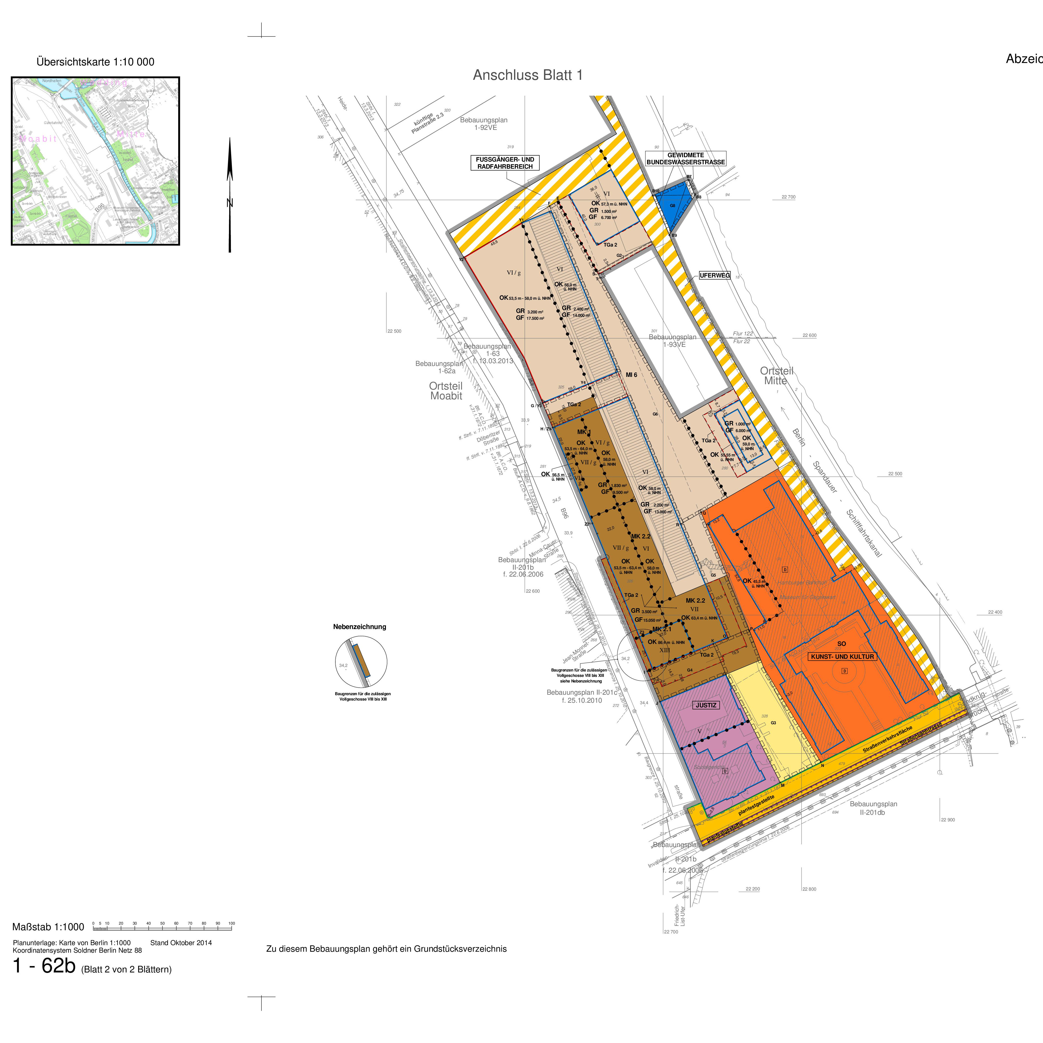 Sechs Bebauungspläne, davon zwei vorhabenbezogen, und ein B-Plan planfeststellungsersetzend für den Bereich Heidestraße in Berlin-Mitte. Das städtebauliche Projekt "Europacity" umfasst insgesamt rund 3.000 Wohneinheiten und insgesamt 360.000 m² Büro-, Einzelhandels- und Gastronomieflächen nördlich des Berliner Hauptbahnhofs.