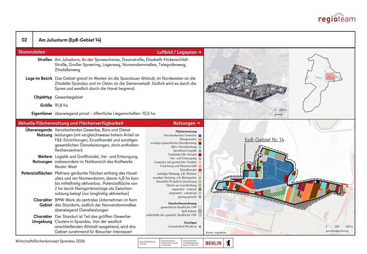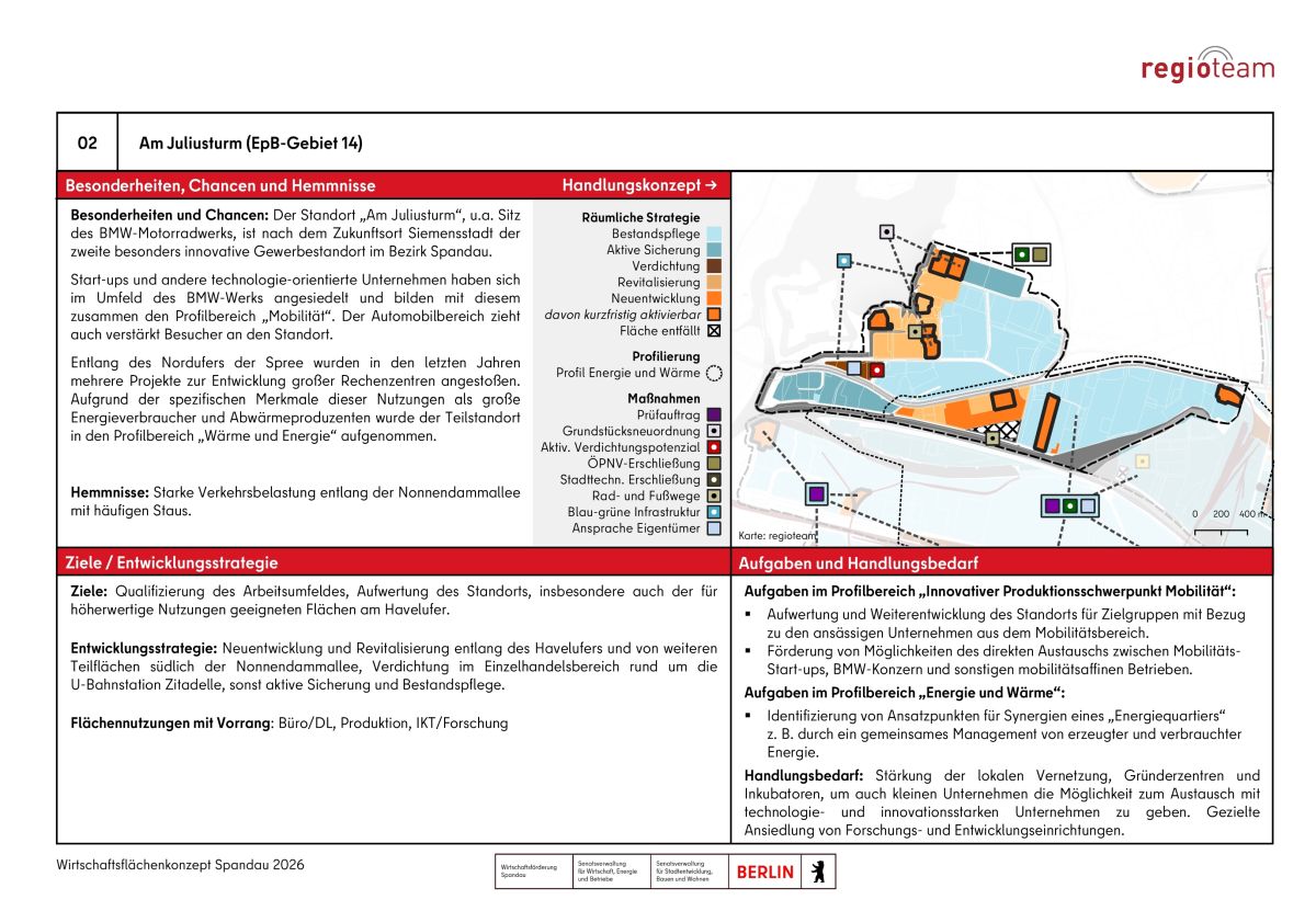 Im Wirtschaftsflächenkonzept Spandau werden alle in der Flächenkulisse enthaltenen Gewerbegebiete in Form von Standortpässen mit Eckdaten, Entwicklungsmöglichkeiten und Handlungsbedarfen dargestellt. Nachfolgend ist als Beispiel der Standort "Am Juliusturm" abgebildet (klick zum vergrößern):