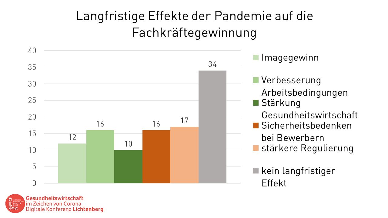 Wie hat sich die Pandemie auf die Fachkräftegewinnung und -Ausbildung ausgewirkt? Die Akteure im Bezirk bemerkten insbesondere bei den praktischen Ausbildungsanteilen deutliche Verzögerungen, vor allem aufgrund der Hygiene-Bestimmungen. Bei der Fachkräfte-Gewinnung verstärkt die Corona-Krise einen bereits länger deutlichen Trend hin zu mehr Social-Media und anderen digitalen Tools (im Gegensatz zur klassischen Job-Messe). Für das Image des Pflegeberufs und damit verbunden für die Arbeitsbedingungen sehen die meisten aber eher keine positiven Effekte durch die gesteigerte Aufmerksamkeit für das Thema in diesem Jahr. Klicken Sie auf die Bilder um die Galerie zu öffnen.